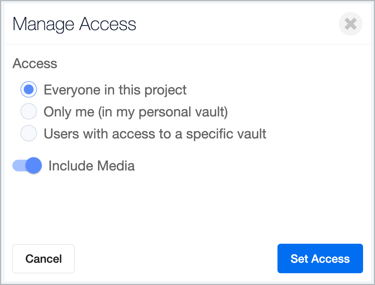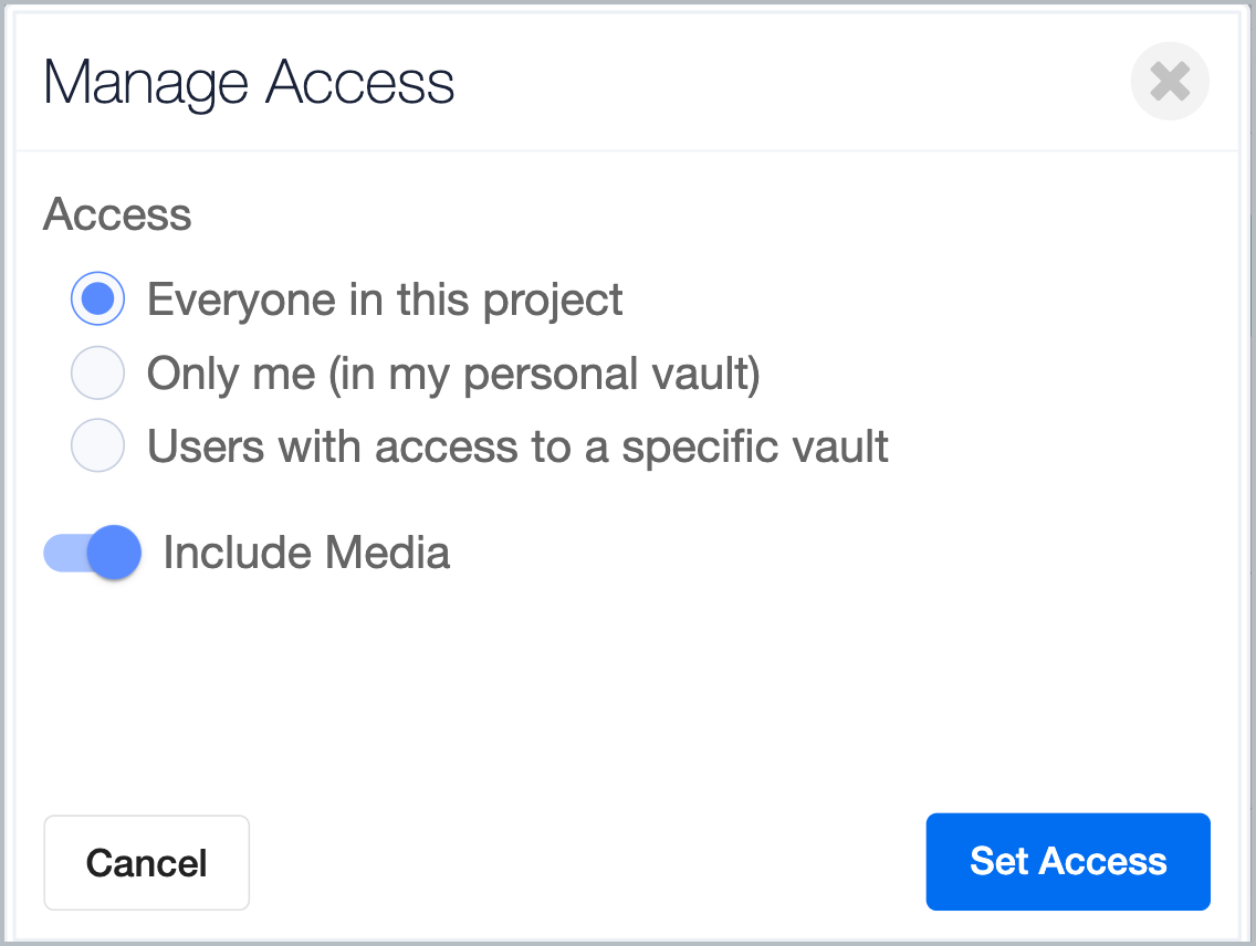 "Include Media" is selected by default. This means that all media (ie documents, files and media) attached to the Card will also be vaulted. If you don't want to vault the Card's media deselect this.