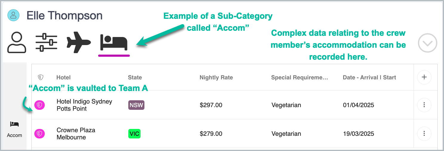 Sub-Categories are nested Categories that can be created under a Card Category, allowing you to manage complex data such as flight information, accommodation etc. For example, under "Crew" you might have the Sub-Categories "Travel" and "Accomodation" allowing you to capture their detailed travel and accomodation information.