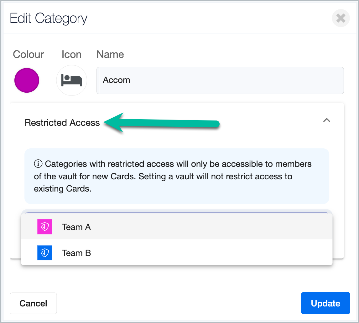 You can restrict access to an entire Category of Cards. For example, you might have a Category called "Celebrities" that includes their personal details that you'd like to restrict, either to your personal vault, or to a select group of users within a team vault.