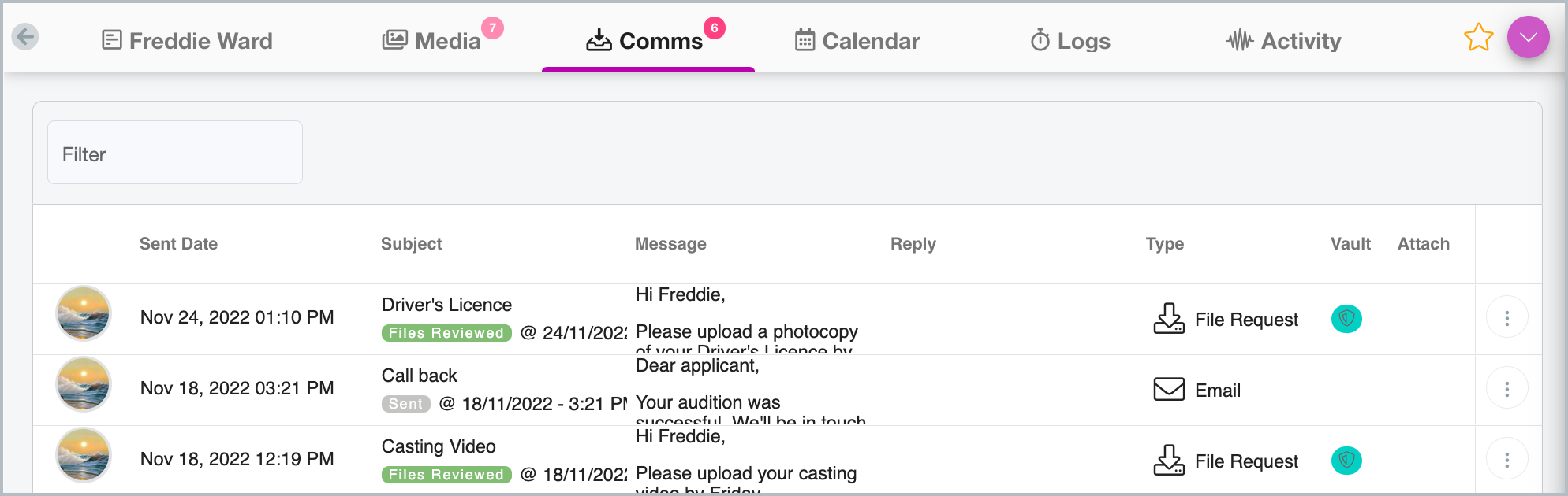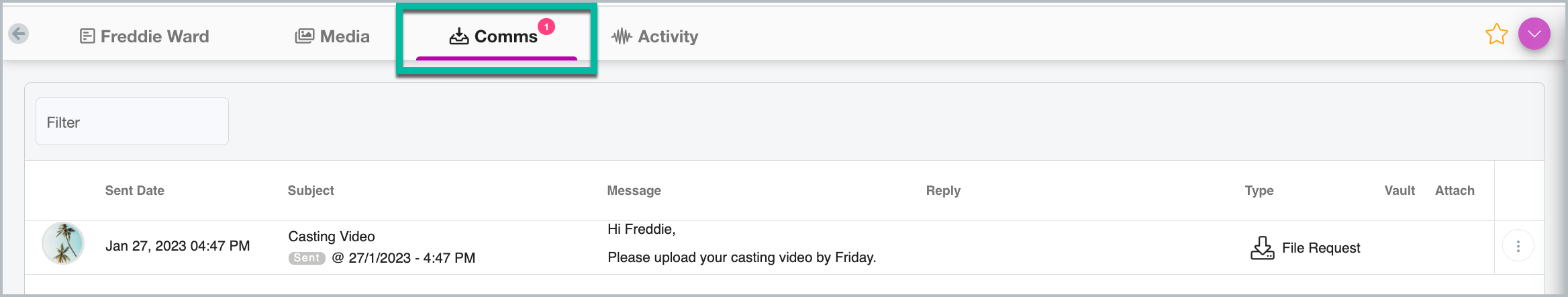 You can perform all the actions that you can in the Communications Centre from an individual's Card. For example, you can send an email or SMS, send a File Request, view their existing communication, import their files or send a reminder.