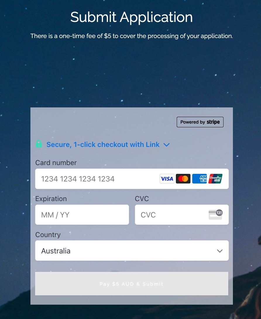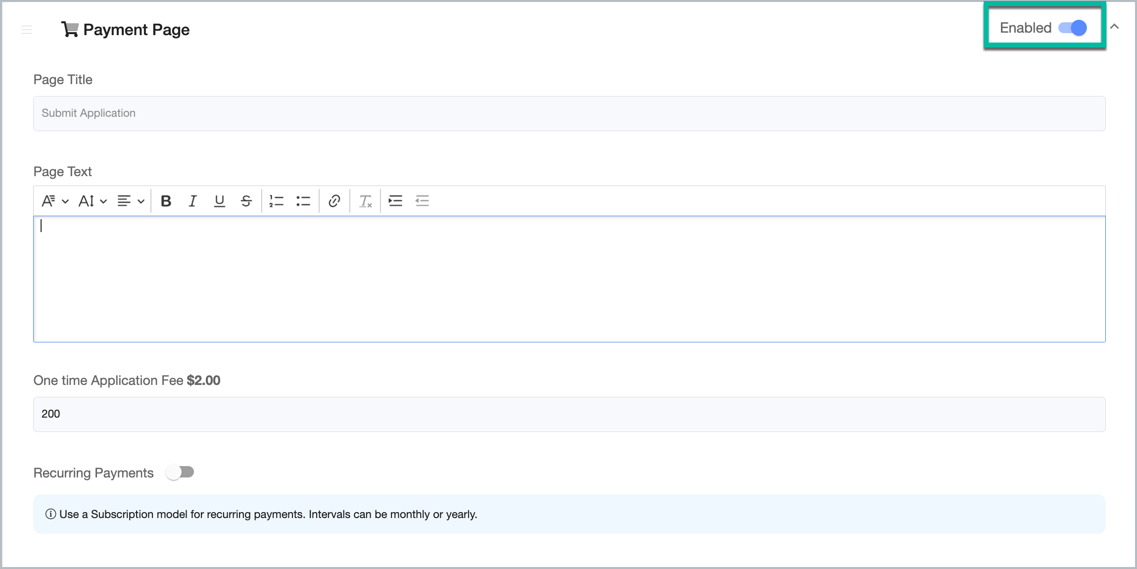 Page Text: Enter your desired text for the submit payment page. For example, "There is a one-time fee of $5 to cover the processing of your application".