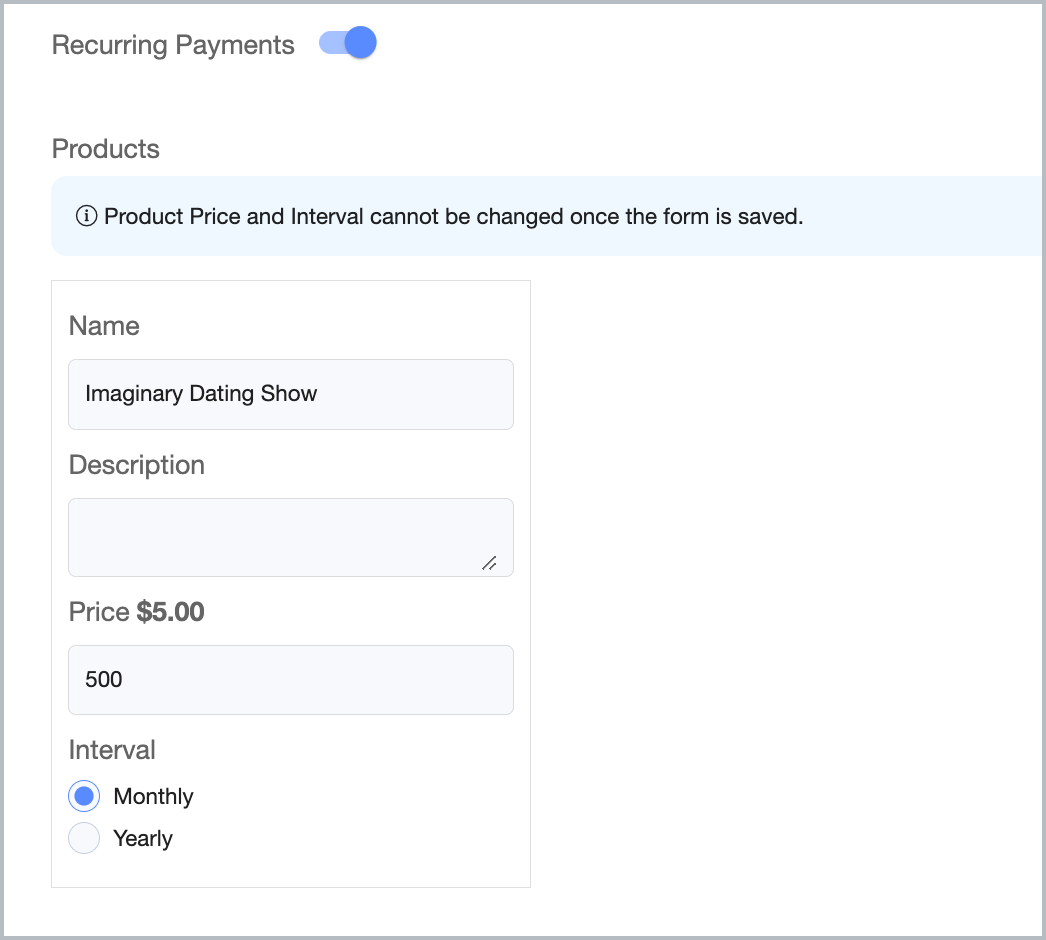 Recurring Payments toggle: Switch to blue (on) which will expand the following fields.