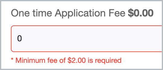 One time Application Fee: Defaults to $2.00 which is the minimum fee. You can edit the amount here. You must enter the amount in cents (ie $5.00 is entered as 500).