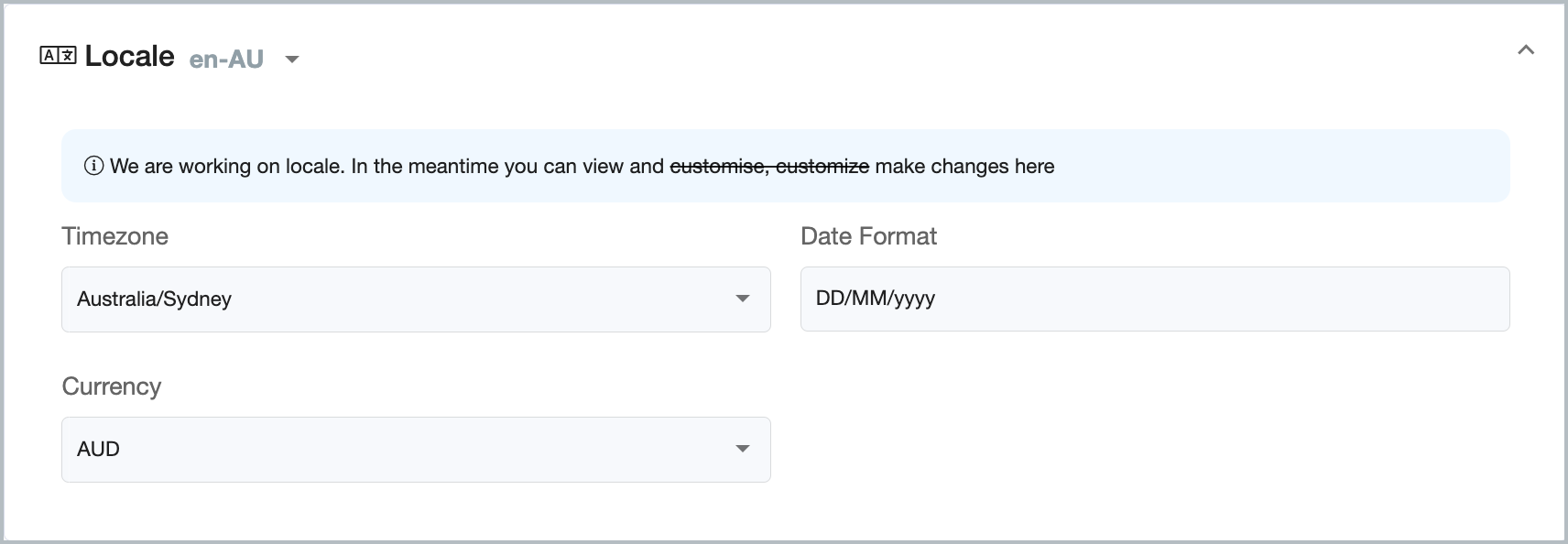 To ensure your Locale settings are correct, expand the Locale section of your application by clicking the downward arrow.
