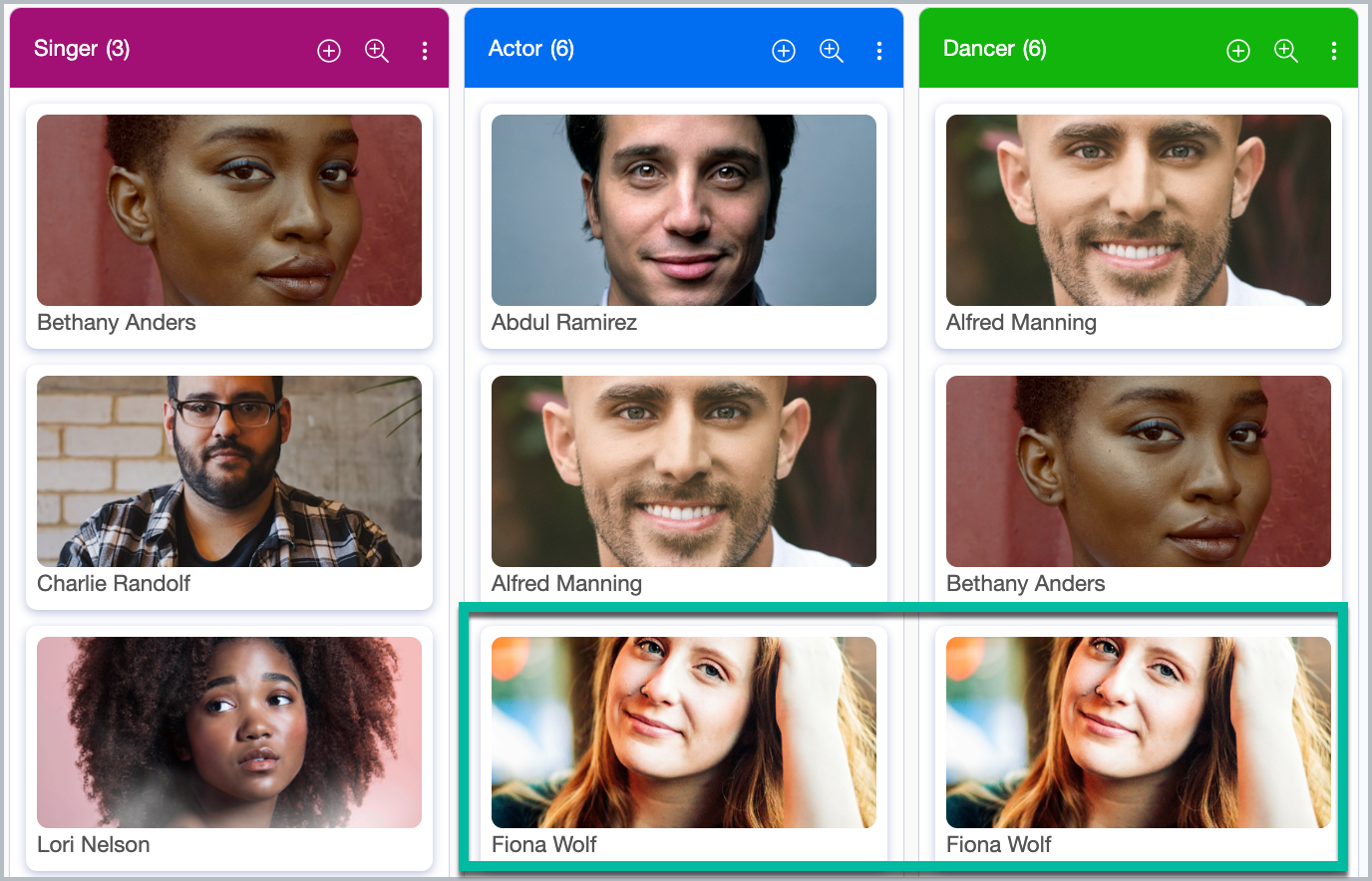 If your kanban is created on a multiple choice field, when you drag a card to another column it will ADD the destination column's field value to the card, rather than replacing it. The card will then display on both columns. For example, dragging "Fiona Wolf" from the Actor to Dancer column has updated her "Talents" field to "Actor, Dancer" and she appears on both fields.